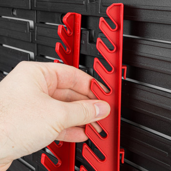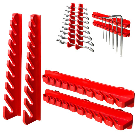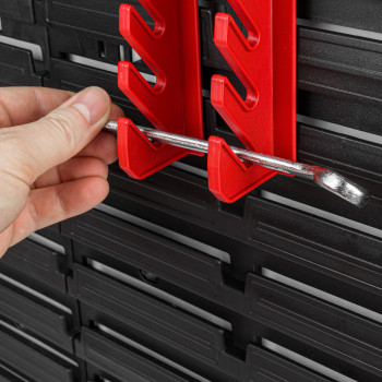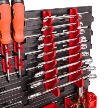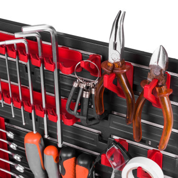 Nasz zestaw składa się z czterech solidnych uchwytów (2 pionowe i 2 poziome), które umożliwiają łatwe i szybkie mocowanie kluczy płaskich i nie tylko. Dzięki przemyślanej konstrukcji, tablica narzędziowa nie tylko wygląda estetycznie, ale także zapewnia maksymalną funkcjonalność. Żywy czerwony kolor ułatwia natychmiastową lokalizację narzędzia, którego potrzebujesz.