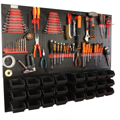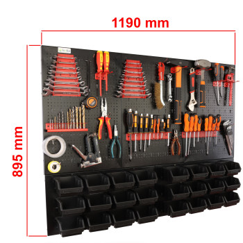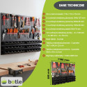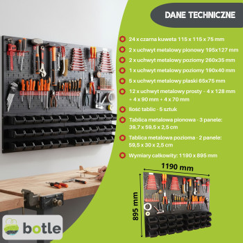 Ta metalowa tablica warsztatowa to kompleksowe rozwiązanie dla osób poszukujących bezkompromisowego porządku. Unikalna, dwuczęściowa konstrukcja łączy w sobie zalety klasycznej tablicy perforowanej z funkcjonalnym panelem magazynowym. Solidne wykonanie z czarnej stali zapewnia estetyczny wygląd oraz wyjątkową odporność na uszkodzenia, co pozwala na bezpieczne użytkowanie w profesjonalnych warsztatach i przydomowych garażach.