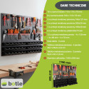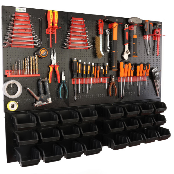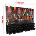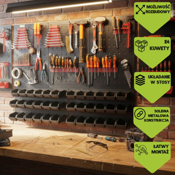 Dolna strefa (Panel na kuwety): Posiada specjalnie wyprofilowane wypusty, które służą do stabilnego zawieszania pojemników warsztatowych. To idealne miejsce na drobne akcesoria, które muszą być zawsze pod ręką.