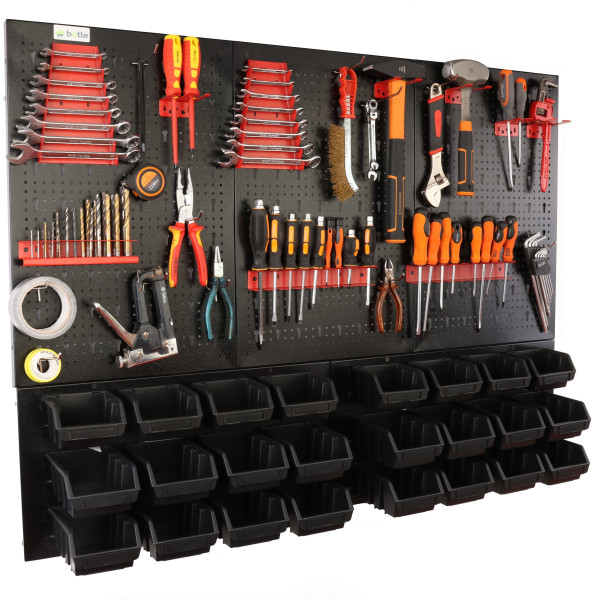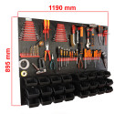 Dolna strefa (Panel na kuwety): Posiada specjalnie wyprofilowane wypusty, które służą do stabilnego zawieszania pojemników warsztatowych. To idealne miejsce na drobne akcesoria, które muszą być zawsze pod ręką.