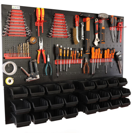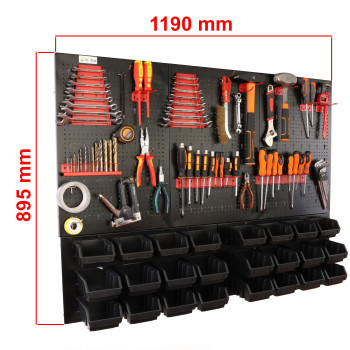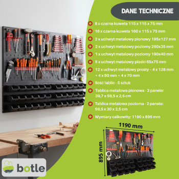 Ta metalowa tablica warsztatowa to kompleksowe rozwiązanie dla osób poszukujących bezkompromisowego porządku. Unikalna, dwuczęściowa konstrukcja łączy w sobie zalety klasycznej tablicy perforowanej z funkcjonalnym panelem magazynowym. Solidne wykonanie z czarnej stali zapewnia estetyczny wygląd oraz wyjątkową odporność na uszkodzenia, co pozwala na bezpieczne użytkowanie w profesjonalnych warsztatach i przydomowych garażach.