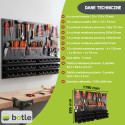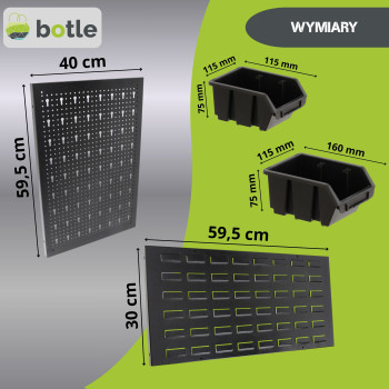 Górna strefa (Perforowana): Wyposażona w gęstą sieć otworów, przeznaczona do montażu różnorodnych uchwytów, haków oraz półek na klucze, wkrętaki czy młotki. System ten pozwala na dowolną rekonfigurację stanowiska w zależności od aktualnych potrzeb.