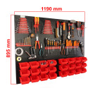 Dolna strefa (Panel na kuwety): Posiada specjalnie wyprofilowane wypusty, które służą do stabilnego zawieszania pojemników warsztatowych. To idealne miejsce na drobne akcesoria, które muszą być zawsze pod ręką.