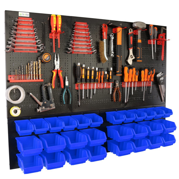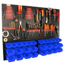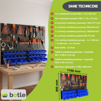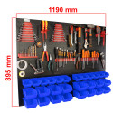 Dolna strefa (Panel na kuwety): Posiada specjalnie wyprofilowane wypusty, które służą do stabilnego zawieszania pojemników warsztatowych. To idealne miejsce na drobne akcesoria, które muszą być zawsze pod ręką.