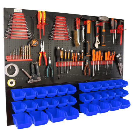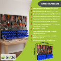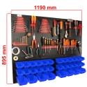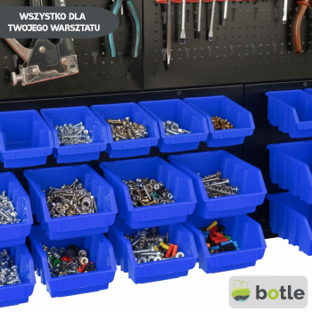 Dolna strefa (Panel na kuwety): Posiada specjalnie wyprofilowane wypusty, które służą do stabilnego zawieszania pojemników warsztatowych. To idealne miejsce na drobne akcesoria, które muszą być zawsze pod ręką.