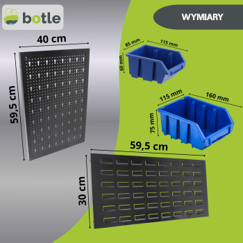 Górna strefa (Perforowana): Wyposażona w gęstą sieć otworów, przeznaczona do montażu różnorodnych uchwytów, haków oraz półek na klucze, wkrętaki czy młotki. System ten pozwala na dowolną rekonfigurację stanowiska w zależności od aktualnych potrzeb.