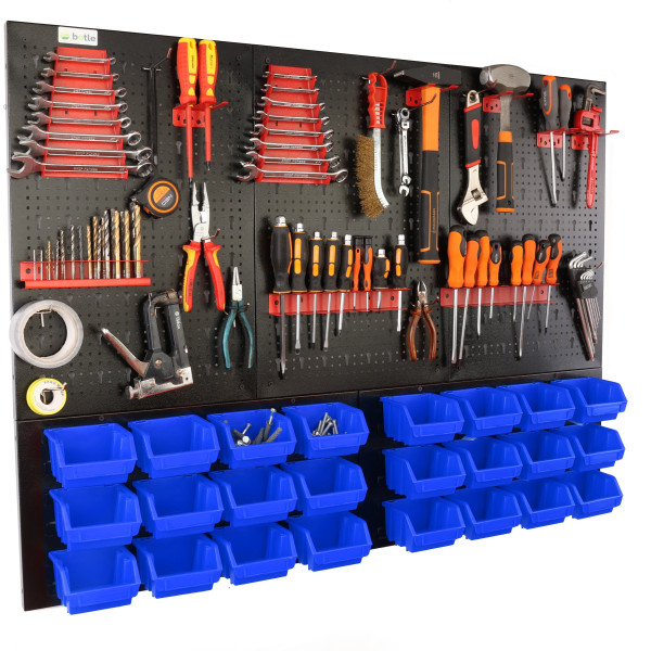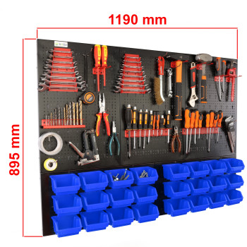 Dolna strefa (Panel na kuwety): Posiada specjalnie wyprofilowane wypusty, które służą do stabilnego zawieszania pojemników warsztatowych. To idealne miejsce na drobne akcesoria, które muszą być zawsze pod ręką.