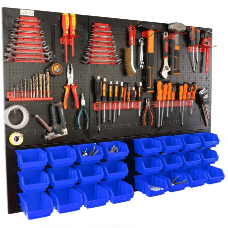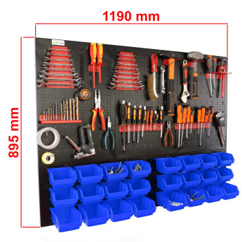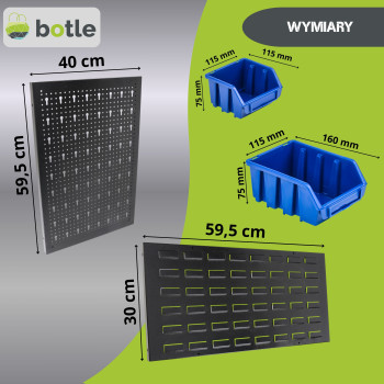 Dolna strefa (Panel na kuwety): Posiada specjalnie wyprofilowane wypusty, które służą do stabilnego zawieszania pojemników warsztatowych. To idealne miejsce na drobne akcesoria, które muszą być zawsze pod ręką.