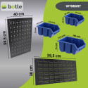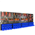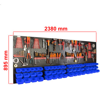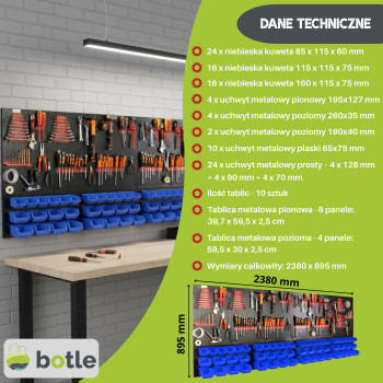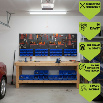 Dolna strefa (Panel na kuwety): Posiada specjalnie wyprofilowane wypusty, które służą do stabilnego zawieszania pojemników warsztatowych. To idealne miejsce na drobne akcesoria, które muszą być zawsze pod ręką.
