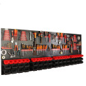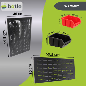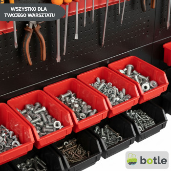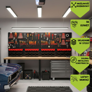 Dolna strefa (Panel na kuwety): Posiada specjalnie wyprofilowane wypusty, które służą do stabilnego zawieszania pojemników warsztatowych. To idealne miejsce na drobne akcesoria, które muszą być zawsze pod ręką.